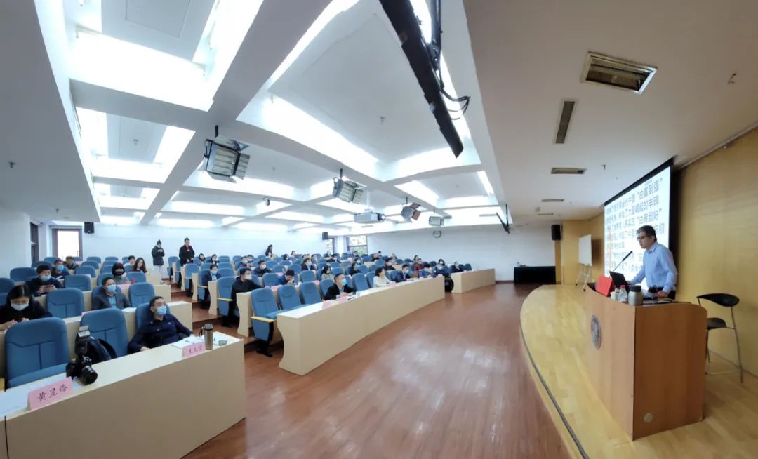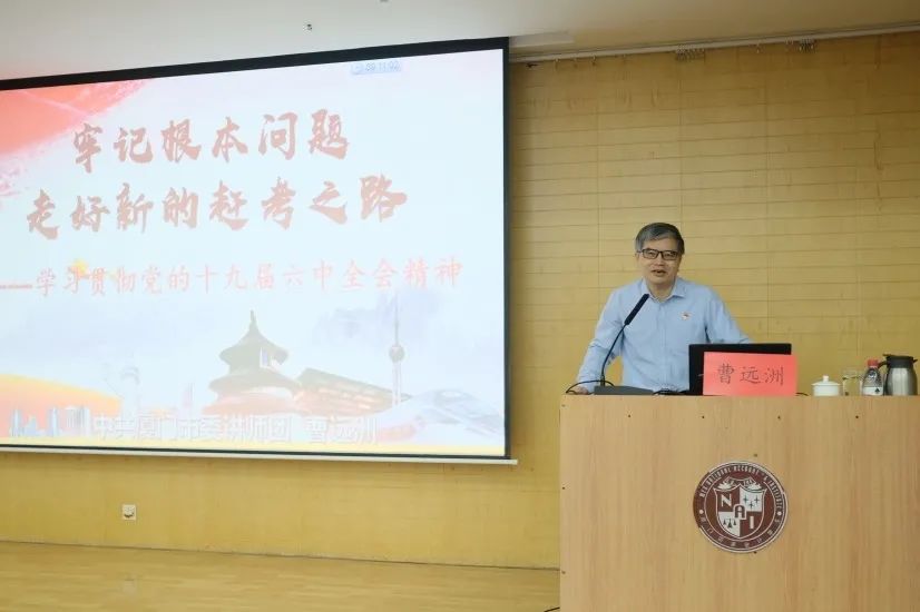 曹遠(yuǎn)洲副教授以《牢記根本問走好新的趕考之路——學(xué)習(xí)貫徹黨的十九屆六中全會精神》為題授課