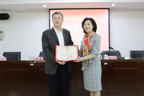 贈(zèng)書儀式上,林曉峰、周旻、潘少鑾等同志分別作了講話。林曉峰會(huì)長(zhǎng)表示,此次贈(zèng)書活動(dòng)是福建省閩南文化研究會(huì)高度重視閩南文化工作,著力加強(qiáng)對(duì)臺(tái)灣歷史學(xué)術(shù)研究,促進(jìn)海峽兩岸中華傳統(tǒng)文化傳承,加強(qiáng)兩岸共同精神家園研究建設(shè)的重要舉措,對(duì)推進(jìn)兩岸融合發(fā)展建言獻(xiàn)策必將產(chǎn)生積極作用。市社科聯(lián)主動(dòng)收藏這兩套重要文獻(xiàn),是廈門市社科聯(lián)重視重要典籍資料的收藏,主動(dòng)抓好兩岸閩南歷史文化研究的具體體現(xiàn)。黨史學(xué)習(xí)教育中,廈門社科聯(lián)十分注重抓好“我為群眾辦實(shí)事”活動(dòng),著眼社科特色,注重為社科界辦實(shí)事、為社科工作者辦實(shí)事。圍繞“第一家園”“第一站”建設(shè),推動(dòng)兩岸融合交流,為閩南文化繁榮和傳承,廈門社科聯(lián)做了大量詳實(shí)細(xì)致工作,前期舉辦的“海峽兩岸(廈門)共同精神家園暨融合路徑發(fā)展論壇”就是社科界“我為群眾辦實(shí)事”的生動(dòng)實(shí)踐。