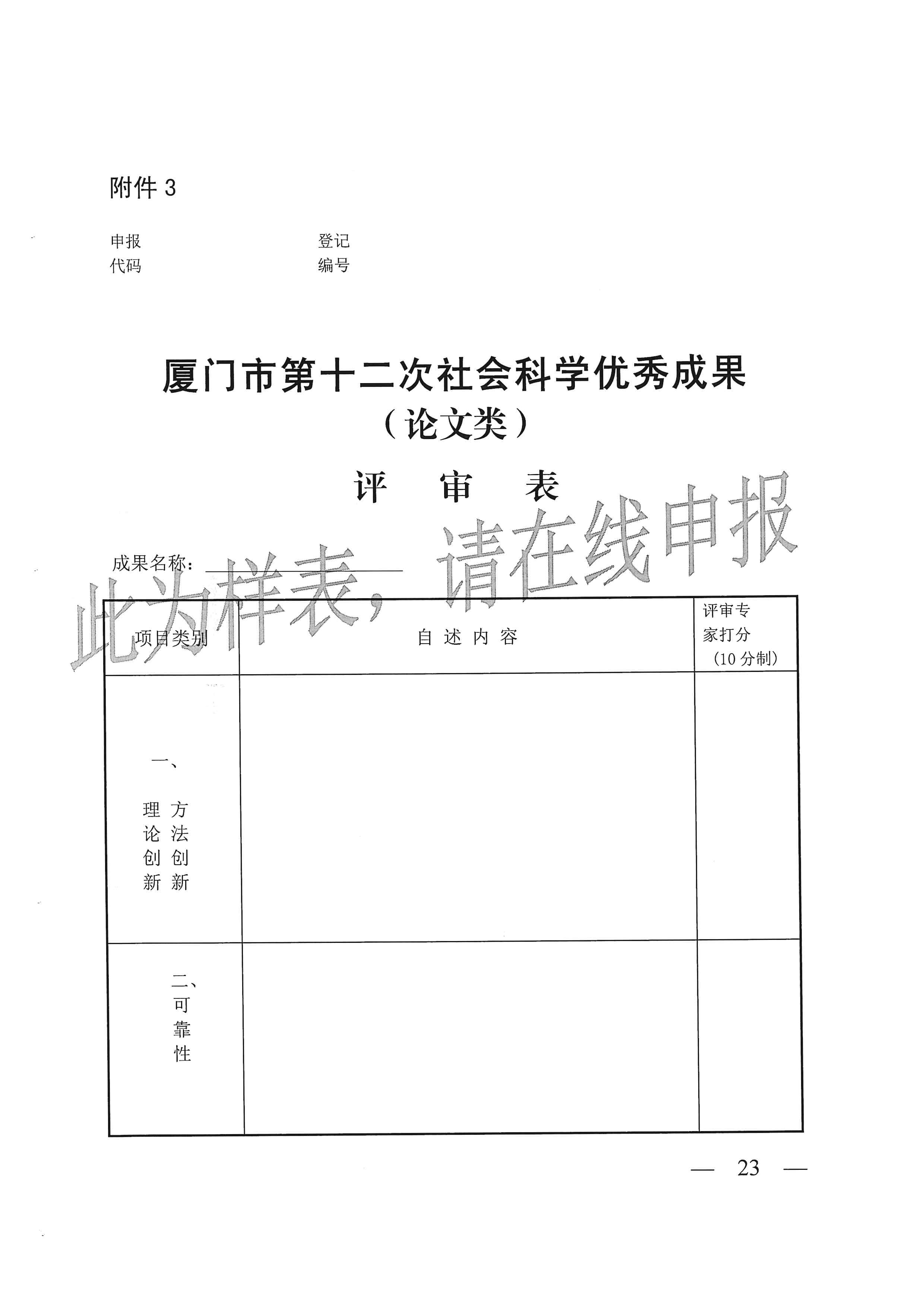 3.廈門(mén)市第十二次社會(huì)科學(xué)優(yōu)秀成果評(píng)審表——論文類(lèi)、調(diào)研報(bào)告、決策咨詢(xún)報(bào)告類(lèi)、著作類(lèi)(樣表)
